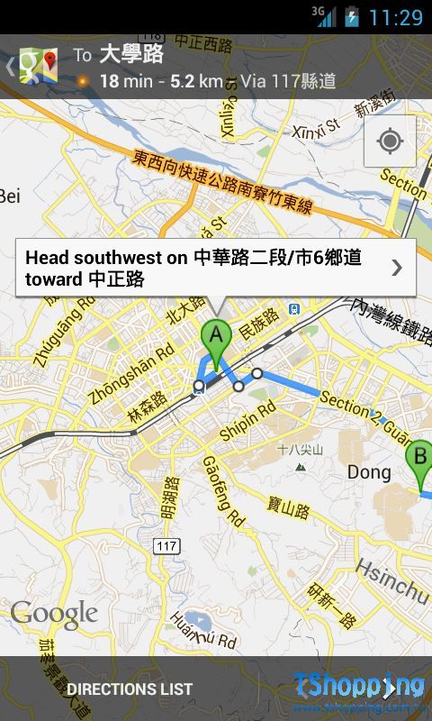 4.路徑規劃 使用Intent.ACTION_VIEW,關聯資料格式如下: http://maps.google.com/maps?f=d&saddr=startLat%2CstartLng&daddr=endLat%2CendLng&hl=tw" startLat為路徑起點緯度值,startLng為路徑起點經度值;endLat為路徑終點緯度值,endLng為路徑終點經度值 Intent intent=newIntent(Intent.ACTION_VIEW,Uri.parse("http://maps.google.com/maps?f=d&saddr=23.979116%2C120.696788&daddr=24.05832%2C120.679065&hl=tw")); startActivity(intent);