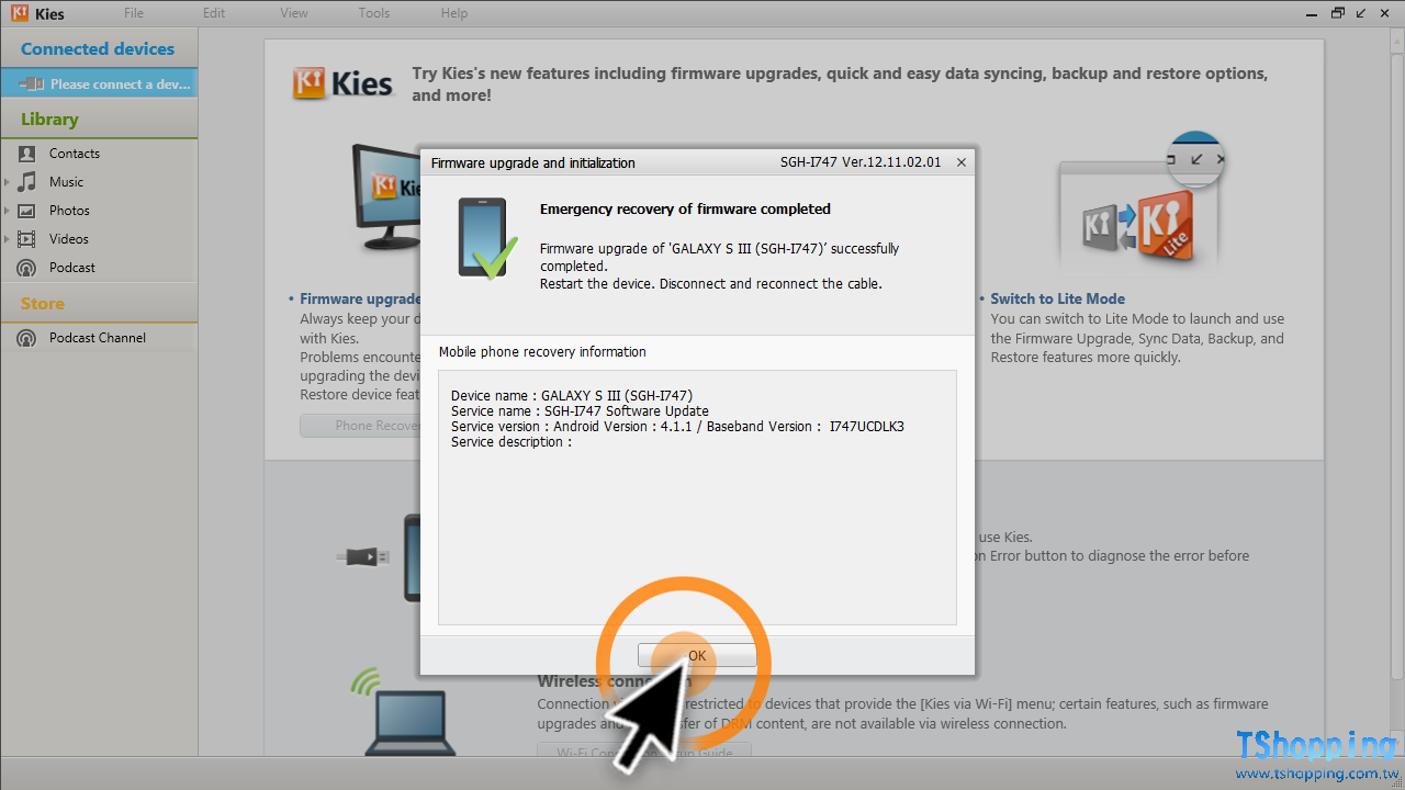 Kies can help you restore the Samsung Android™ operating system (OS), sometimes referred to as your device's firmware, to your device. If your device fails during an update and cannot be recovered using emergency firmware recovery, or you have installed a custom version of the Android OS on your device, you can reload the latest version of the Android OS to your device. Kies 是三星提供的連線同步手機的工具,如果不小心ROOT到就無法升級了,用雙WIPE是無法更新ANDROID版本的 那只好透過電腦USB與手機連線回復原始狀態 Note: This feature is not available for all devices. When you select the option, Kies will verify the availability for your device. If your device is not supported, contact Samsung Product Support for further assistance. Warning! This process permanently deletes all information from the device. The information will not be recoverable if you proceed with this process. 首先先到三星官網下載Kies同步軟體 Samsung Product Support