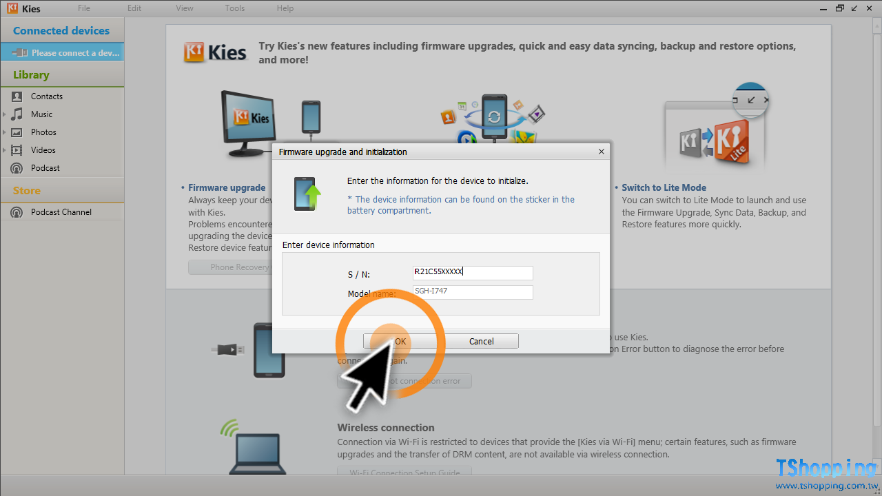 ![]() 3.You will be asked to enter your serial number (S / N). The serial number is located near the model number. The serial number format will vary based on the type of device you are using. Do not enter your IMEI or MEID. Any letters in the serial number should be entered in all CAPS. Click Next.然後輸入S/N 打開手機背蓋,找到S/N字樣,輸入及可 ![]() 4.Kies will verify that the feature is available for your device. If the feature is available, click OK to continue.(Kies確認手機型號後,點選OK) ![]() 5.The firmware version is displayed along with a note that the information on your device will be permanently deleted during this process. Click OK to continue.(點選OK)