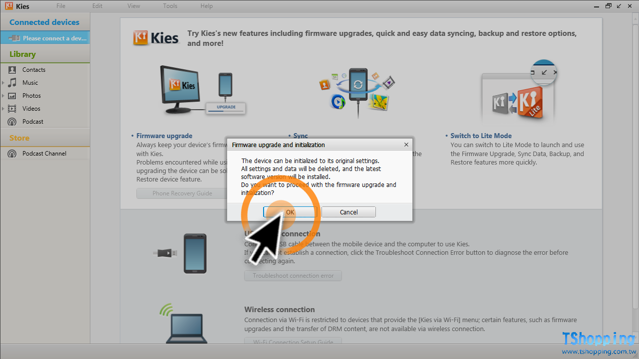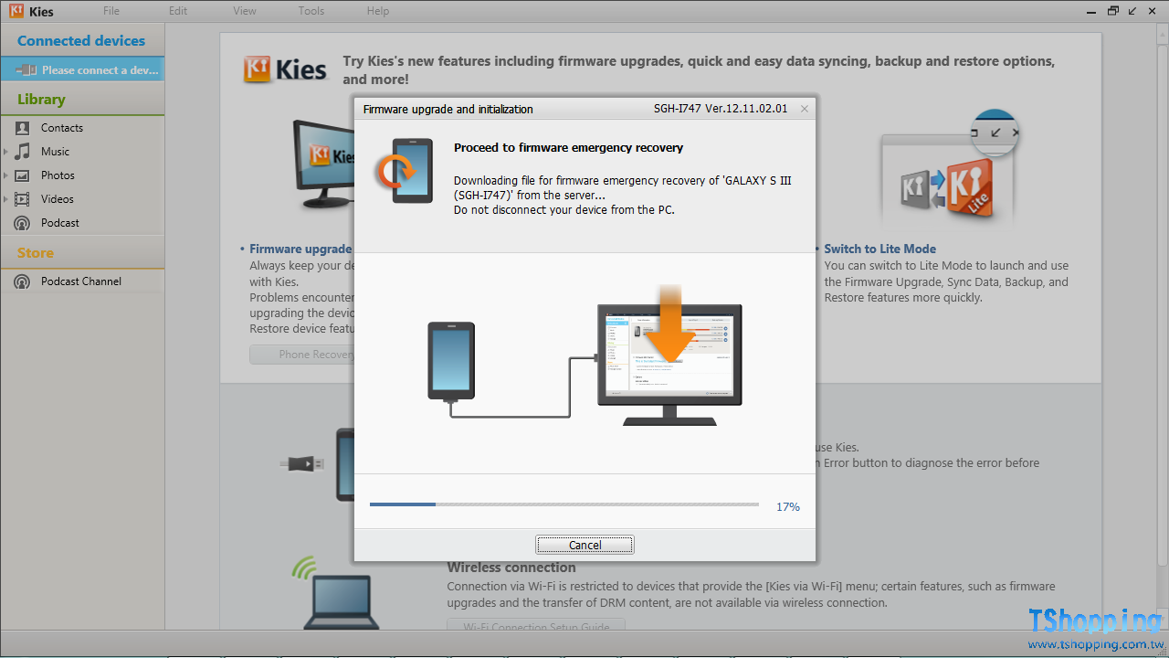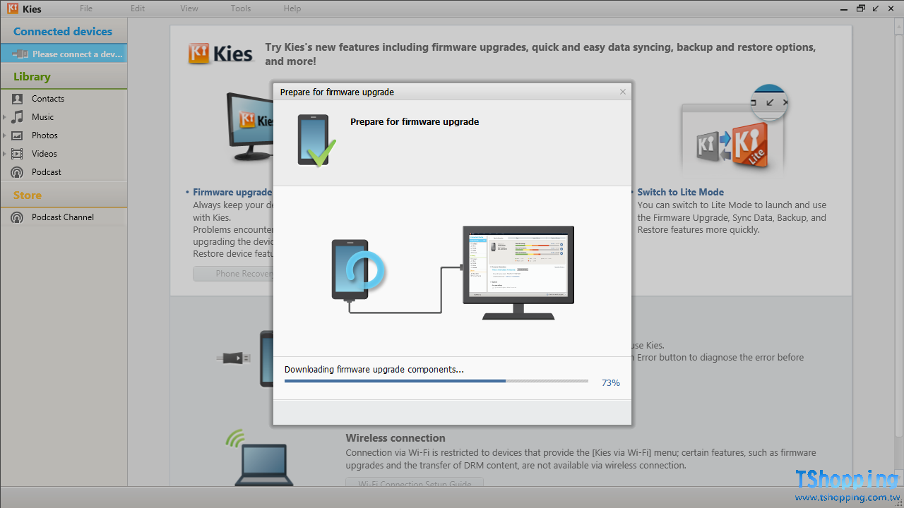 6.Kies will download and prepare your system to update the firmware. This process can take some time. The time will vary based on your network and computer capabilities.(Kies會開始下在更新檔案到你的電腦上,並更新韌體,這時必須確認網路有與電腦連線)