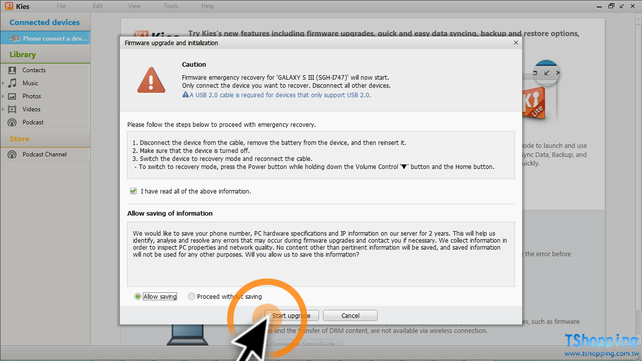 7.Respond to any security warnings concerning installing software to continue.(安裝前的警示視窗) 8.Follow the steps to prepare your device for emergency recovery. Mark the checkbox next to I have read all of the above information. Select your desired information saving option regarding sharing this update with Samsung. Connect your device to Kies when you have activated download mode. When your device is in the correct mode and connect to Kies, the Start upgrade button is available. Click Start upgrade to reinstall the firmware.(點選 Start upgrade 重新安裝至韌體)