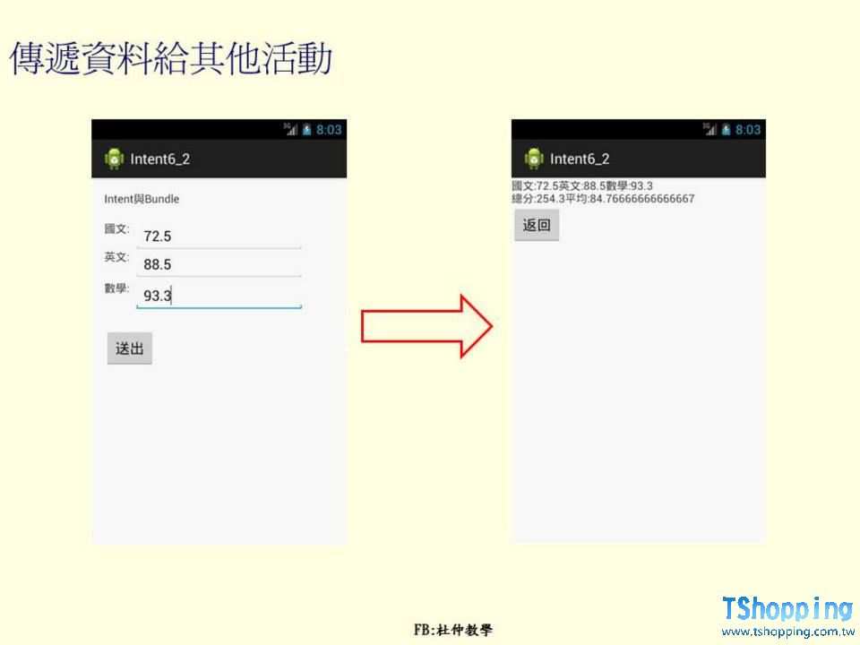//2.藉由setClass()方法設定來源與目的地類別 myIntent.setClass(First.this, Second.class); //3.建立Bundle物件,利用putString(鍵值,資料)方法新增字串資料 Bundle bundle = new Bundle(); bundle.putString("HEIGHT", height.getText().toString()); bundle.putString("WEIGHT“, weight.getText().toString()); //4.使用Intenet物件的puExtras()方法,附加Bundle物件 myIntent.putExtras(bundle); //6.啟動活動 startActivity(myIntent); */