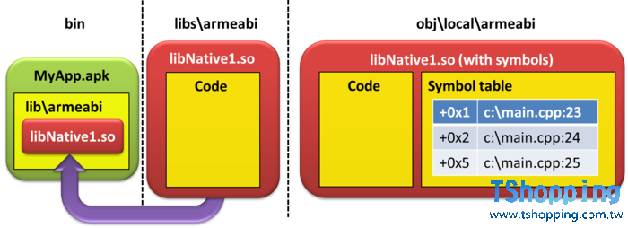 這篇文章主要列舉了解決幾種斷點失效的經驗和方法,對於那些苦苦掙扎在莫名其妙的問題中的開發者也許有較大的幫助。 概述首先,讓我們看一下一個典型的包括本地代碼的Android應用的結構: ![]() 應用代碼被打包存放在一個.apk文件中,實際上,.apk文件就是一個ZIP格式壓縮包,壓縮包中包括一個classes.dex文件(所有的Java代碼都包含其中)和一個或更多存放在lib\<EABI名稱>目錄下的本地代碼庫文件。正常情況下,包含本地代碼的應用的工作步驟如下所述: 每個本地代碼庫都有兩個版本: