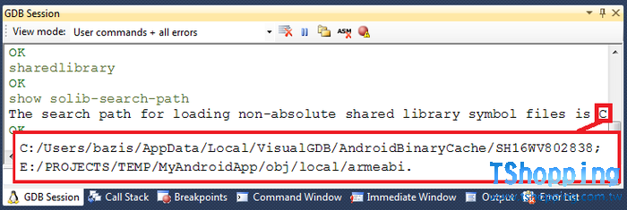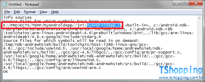 這3步操作任意一步失敗,斷點就不會被創建,或者創建錯誤從而導致永遠都不會被觸發。我們在下一小節介紹這種問題的診斷方法以及如何修復它。 診斷問題本小節將詳細描述如何檢查由於不規範配置或文件缺失導致斷點失效的方法。 A. 確保庫文件已被加載 第一件要做的事情是確定本地代碼庫是不是已經被加載了,並且GDB是不是已經知道這件事情。我們可以在GDB中輸入“info shared”命令來查看。 ![]() info shared命令結果包含三個重要信息: From To Syms Read Shared Object Library 如果有些庫文件沒在這顯示出來,那麼可以通過”sharedlibrary”手動強制GDB重新加載一次符號表。 ![]() 可以看到你項目的obj/local/armeabi目錄路徑被打印出來,該目錄下應該包含了帶有調試信息的.so文件,如果在該目錄下沒有.so文件的,那麼將正確的.so文件複製到該目錄下並重新運行”sharedlibrary”命令。 還有一個比較常見的導致斷點失效的原因是你再生成和調試項目時使用不同的目錄。舉個例子,如果你編譯庫文件時項目源代碼位於c:\projects,然後你又將源代碼移到d:\projects目錄下,這時在d:\projects\main.cpp文件中設置一個斷點就會失敗,GDB並不會使用d: \projects\main.cpp這個源文件替代原來目錄下的文件。像這一類問題都可以通過檢查源文件並且和設置斷點時的源文件做比較來解決,你可以先移除所有斷點,然後重新設置這些斷點,再看看你的IDE中顯示的GDB命令,看看到底是在哪個源文件中設置的斷點,是不是和生成庫文件時的源文件一致。 ![]() 從上圖可以看到用來設置斷點的-break-insert命令可以顯示出你使用的源文件路徑,再使用”info sources”命令可以看看GDB真正發現的是哪些源文件。 ![]() 將這條命令的輸出結果復製到一個文本編輯器中,然後再去查找你想調試的源文件(比如說說MyAndroidApp.c): ![]() 如果在輸出結果裡沒有你想要調試的源文件,那麼說明你家在的.so文件版本錯了(關於.so文件的版本問題見上一小節)。如果數據結果有你想要調試的文件,但是路徑和你使用-break-insert命令時顯示的源文件路徑不一致,這是你就需要再找找什麼原因了。這種情況下,在新路徑下重新編譯生成你的項目,或者將源文件放回到老的路徑下,這樣就可以保證你設置斷點的源文件和”info sources”命令輸出的源文件路徑保持一致了。 如果你設置了斷點,但是從來沒有生效,也有一種可能是你的Android應用加載的.so文件和你的GDB用來計算地址的.so文件版本不一致造成的。導致這種情況的最常見原因是Android加載時有bug,它沒有去加載armeabi-v7a目錄下的文件,而是加載了armeabi目錄下的庫文件。如果你覺得有可能是這個問題,試試修改編譯生成的配置,要么在armeabi平台編譯,要么在armeabi-v7a平台編譯,千萬不要同時再者兩個平台下編譯。(【譯者註】原作者前面沒有提到armeabi-v7a,現在突然冒出來了,armeabi和armeabi-v7a是不同的CPU類型,後者帶有包括浮點運算等其他功能,通過Android.mk文件中的target_cpu_api來指定,如果選擇了armeabi-v7a的話,前面提到的xxx\armeabi目錄都會變成xxx\armeabi-v7a,一個帶有NDK開發的Android項目中可能有多個Android.mk,原作者的意思就是所有的Android.mk文件的target_cpu_api設置都要一樣) |