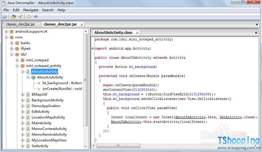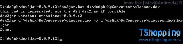 以下是我的操作步驟: ============================= Step 1: 解開 apk. 我是用 7z 把 apk 直接當作 zip 檔解開即可. Step 2: 透過 AXMLPrinter2.jar把 XML 檔案還原. ![]() 說明: AndroidManifest.xml 可以還原, 沒有錯誤訊息, 但我試了 layout 裡的 xml, 卻失敗, 只還原了第1行. Ex: java -jar ..\AXMLPrinter2.jar AndroidManifest.xml > AndroidManifest.txt Step 3: 透過 dex2jar把 classes.dex 還原為 jar 檔 ![]() 說明: d:\deApk\KgConverter\classes.dex 被還原為 d:\deApk\KgConverter\classes_dex2jar.jar, 直接透過 7z 就可以再把這一個 jar 檔解開, 就可以看到 .class 的檔案. Ex: C:\deApk\dex2jar-0.0.9.13\dex2jar.bat classes.dex Step 4: 透過jad把 compiler 過的 .class 還原為 javasource code. ![]() Ex: C:\deApk\dex2jar-0.0.9.13\dex2jar.batclasses.dex |