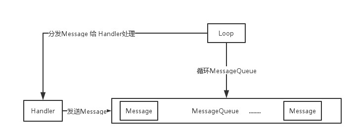 Handler、Looper、Message 和MessageQueue 的關係Handler 向MessageQueue 發送Message,Looper 負責循環MessageQueue 中的Message 並向Handler 分發Message,最後Handler 負責處理Message。示意圖如下