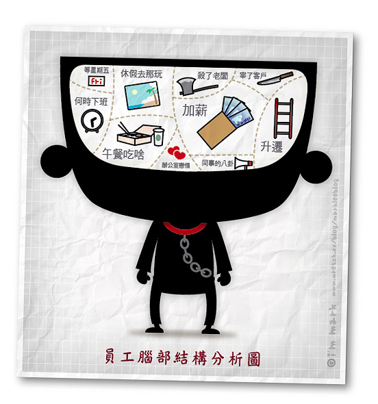 【員工篇】 雖然各行各業的工作內容天差地別, 每個員工的喜怒哀樂也不盡相同, 但他們腦子中大概卻充斥著大同小異的事情, 彙整之後每日員工腦中的事約略是以下幾點…