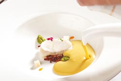 馬鈴薯濃湯/1450元套餐熱前菜▲以桌邊服務方式將美國馬鈴薯與蒜苗、雞高湯熬煮的濃湯倒入盛有干貝、培根碎的盤中。