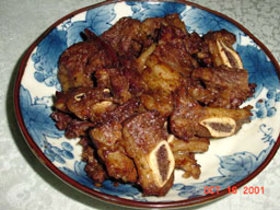 做法很簡單, 混合醃肉料,將牛小排醃兩小時(以上), 用多量油炸/炒熟即可(約1~~1+1/2 杯的油吧!看肉量多寡,如果是牛肉片,可用一般炒肉的油量就好了), 牛小排亦可用炭火烤,會更好吃