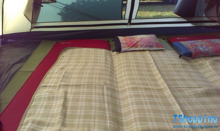 我家帳篷內的基本裝備:從帳篷底部往上依序鋪上防潮墊,睡墊,蓆子(天熱時),枕頭