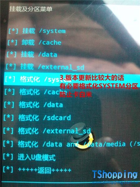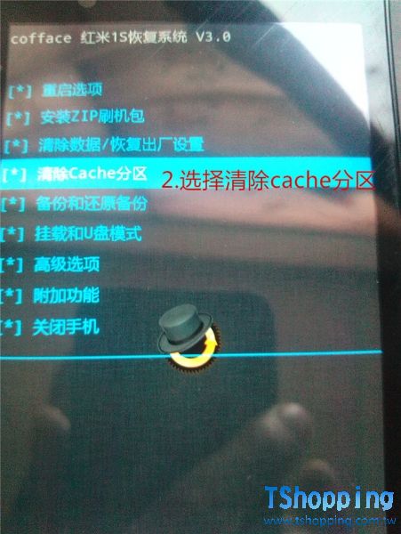 4:返回到recovery主界面,然後用音量鍵選擇【清空Cache分區】,然後再選擇【是的-清空Cache】然後按電源鍵確認