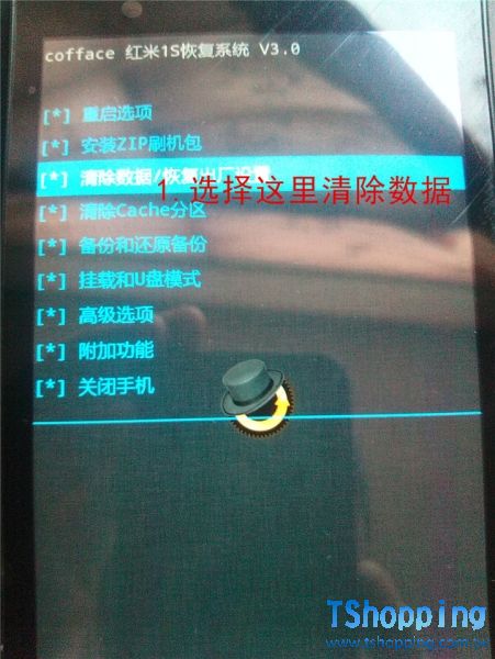 3:用音量鍵選擇【清空數據/恢復出廠設置】然後再選擇【是的-清空所有數據】然後按電源鍵確認