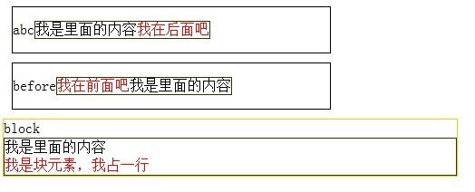 - .block:after{content:'我是块元素,我占一行'; color:#F00; display:block;}