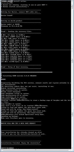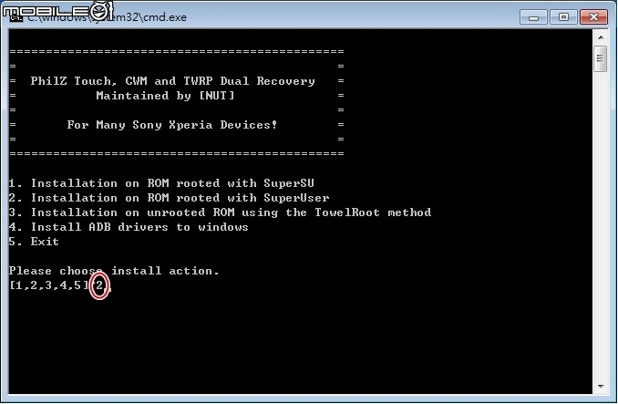 Step3. 視窗看到<<Please choose install action>> 這項 建議選2(如下圖)後按Enter便自動執行寫入程序 , 此時回看手機會彈出[允許USB偵錯]視窗 請將"一律允許"打勾並按"確定"繼續執行程序 , 幾秒後手機又彈出視窗這次是授權管理請求當然是按"允許" , 再過幾秒手機會自動關機進入recovery(如下圖)