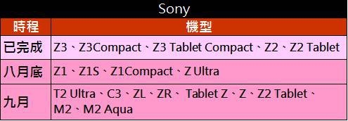 已可升級: 所有Z系列(Z3、Z3 Compact、Z3V、Z3 Dual、Z1、Z1 Compact 、 Z Ultra...)、 Xperia T2 Ultra 、C3。