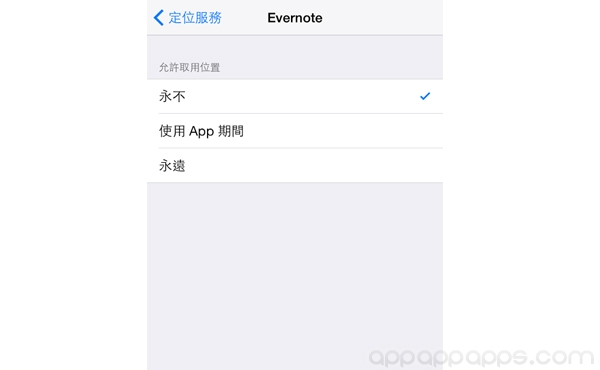 去 iOS 設定 – 隱私權 – 定位服務,就可以看到每個 app 的設定。通常你都有三個選擇「永不」、「使用 App 期間」、「永遠」。如果你認為無需定位的 apps,你大可以設為「永不」。