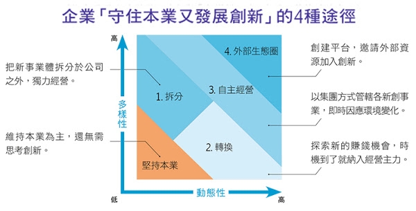 在既定產業規則裡考高分的優等生,很容易被思考慣性綁架,成為最難跳脫框架、開創新未來的一群人。這就是企業創新的難題,經營者可以怎麼突破? 我有個客戶在越南,是當地所屬產業內前幾名的大集團,本業績效卓著。 在網路與科技的大趨勢下,該公司高階主管也都體認到,發展新事業的重要性。可是,每次一談起「創新專案」,許多產業優等生就「卡住了」!有些是缺乏危機意識,認為沒必要變革;有些顧忌本業發展,不敢大膽創新;有些則缺乏新思維。 總之,這群人往往被思考慣性或成功模式綁架,難以開創新未來。這通常不是單一企業遇到的問題,幾乎每個經營者都眼見新科技破壞了行業的遊戲規則,著急地成立新事業的研究團隊,但最後成功找出新方向的企業卻微乎其微。 難道本業持續獲利(exploitation)與新事業探索(exploration),這麼難以兼得嗎?波士頓顧問公司(BCG,The Boston Consulting Group)資深合夥人馬丁‧瑞夫斯(Martin Reeves)在《你的策略有什麼策略》(暫譯,原文書名為《Your Strategy Needs a Strategy》)一書裡,針對企業在穩固本業之餘,還能不斷創新,提出了新的思考方法。 瑞夫斯以企業的「動態性」(Dynamism,指產業環境的變動程度)和「多樣性」(Diversity,指公司經營範疇的多元性)為兩軸,區分出 4 種可行做法,協助企業在既有事業之外,發展新的獲利模式,就像網球高手一樣,左右手都能擊出強而有力的球。