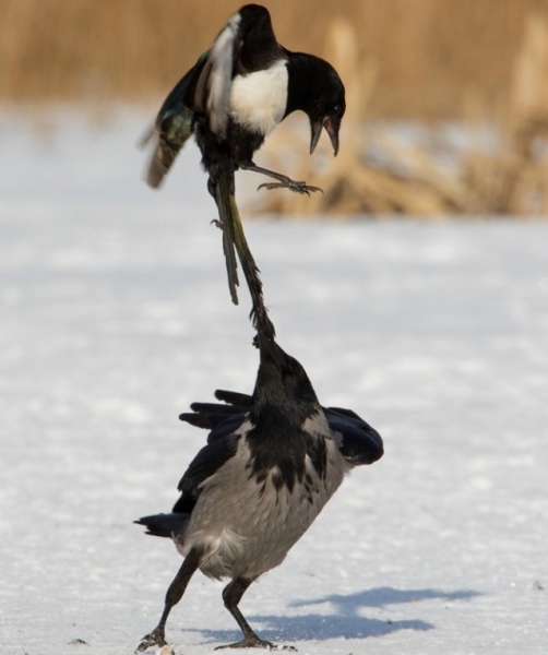 拉尾巴這種行為在烏鴉根本就是刻印在烏鴉的靈魂和基因之中,每隻烏鴉都會幹! 最初生物學家們以為烏鴉的這種舉動是為了干擾對方並搶奪牠的食物,但後來卻發現,就算對方只是站在那發呆,烏鴉還是會獨自或是組團去拉人家的尾巴...