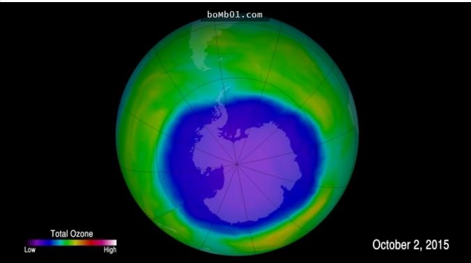 科學家第一次掌握明確證據, 臭氧層破洞的確開始修復。 下圖是2015年10月的臭氧層破洞面積。