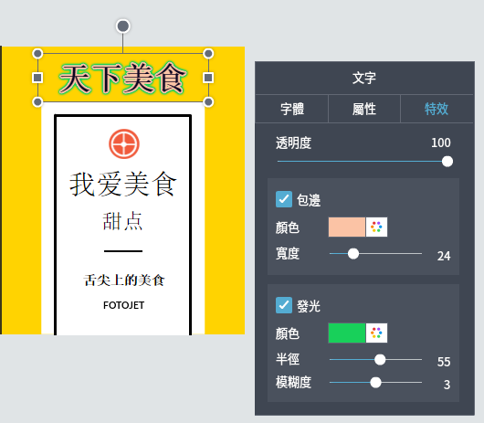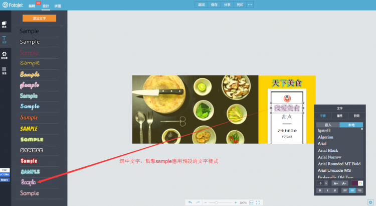 如需更加快速改變字體,只需選中需要改變的文字,然後點擊左側字體樣式欄內的Sample樣式便可以快速應用FotoJet預設的文字樣式了。