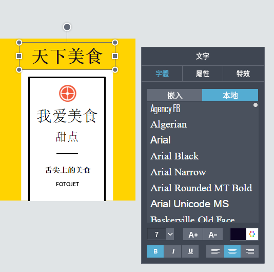 然後你可以根據自己的需求添加文字並修改文字樣式。FotoJet提供內置文字字體並允許用戶從本地使用自己電腦上的文字字體,最大限度滿足了用戶需求。如果你有自己喜歡的字體,可以直接下載到自己的電腦上,然後在“本地”字體裡就可以直接應用了。還可以隨意調節文子的顏色,大小,對齊方式,等。