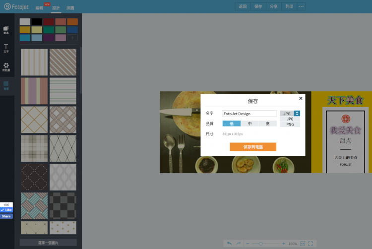 當然,圖片背景也是可以隨意更改的。你只根據自己的需要稍微更改設計就可以了。FotoJet提供三種更換背景的方式:顏色背景,預設圖片背景和自定義圖片背景。選擇你需要的更換即可。全部設計弄好之後,就可以直接存檔了。點擊“保存”選項,選擇圖片格式(JPG, PNG)跟圖片品質點擊“保存到電腦”即可。由於臉書對首頁圖片的尺寸是有規定的,為了減少用戶製作的麻煩,FotoJet就直接預設這些FB範本大小為851x351px。你只需直接保存就好。