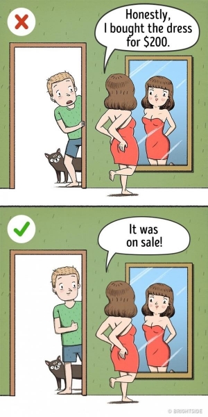 每一對夫妻一定都聽過很多所謂讓婚姻生活更美滿的小秘訣,但是大家給你的意見真的都是正確的嗎?其實事實上可能有很多建議都只會害你過得更慘… 一起來看看到底應該怎麼做吧! 1.永遠別對另一半說謊。曾經跟你說過「不要對另一半說謊」的人自己可能都無法遵守這個原則,因為事實是,每個人一定都會說謊。沒有完全說出實話、有事沒跟對方說當然也包含在內。想想看你如果跟另一半說這件洋裝是在拍賣時買的,是否會比照實告知一件6000元能省下多少爭吵?