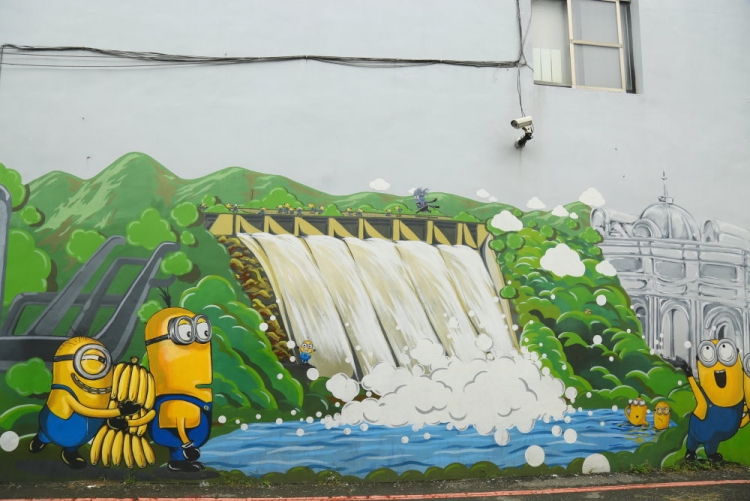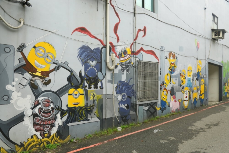 位於大溪鎮仁和路二段60巷,小小兵彩繪牆是由新興高中一群廣告設計同學