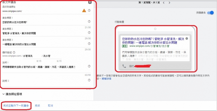 到 google 搜尋 洗水管,就可以看到 管乾淨 的廣告,位在廣告的第一名