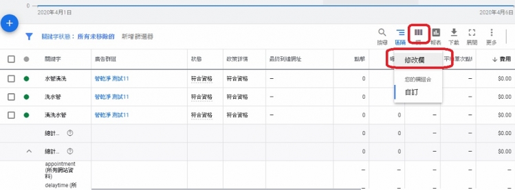 點選 "關鍵字"-> 修改欄 -> 找到品質分數(預設是關閉的)並勾選
