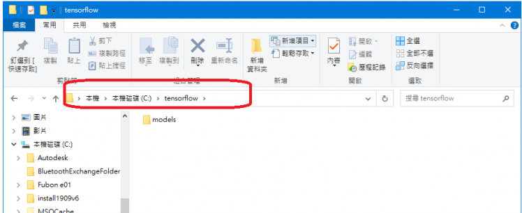 從GitHub下載TensorFlow Repo.,點擊Clone或下載,接著在C碟中創造一個資料夾叫做tensorflow,然後將剛剛下載的models-master壓縮檔解壓縮在剛創建的C:\ tensorflow目錄中,並將名稱改為models。