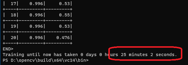 opencv_traincascade -data data -vec pos.vec -bg neg.txt -numPos 1000 -numNeg 500 -numStages 20 -w 20 -h 30