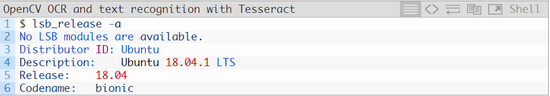 如上所示,我的機器上執行的是 Ubuntu 18.04,不過你在繼續操作之前需要先檢查自己的 Ubuntu 版本。 對於 Ubuntu 18.04 版本的使用者,Tesseract 4 是主 apt-get 庫的一部分,這使得通過下列命令安裝 Tesseract 非常容易: