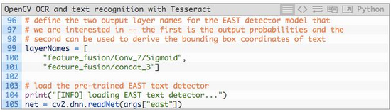 第 99 到 101 行,將兩個輸出層名稱轉換成列表格式。然後,將預訓練 EAST神經網路載入到記憶體中(第 105 行)。 必須強調一點:你至少需要OpenCV3.4.2 版本,它有 cv2.dnn.readNet 實現。 接下來就是見證第一個「奇蹟」的時刻: