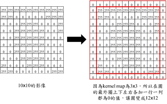 是不是卷積計算後,卷積後的圖是不是就一定只能變小?ANS: 用zero padding 這個手法就是看你會消失多少的大小,在輸入的圖部份就給你加上0元素進去,這個手法稱為zero padding,實際作法如下圖。