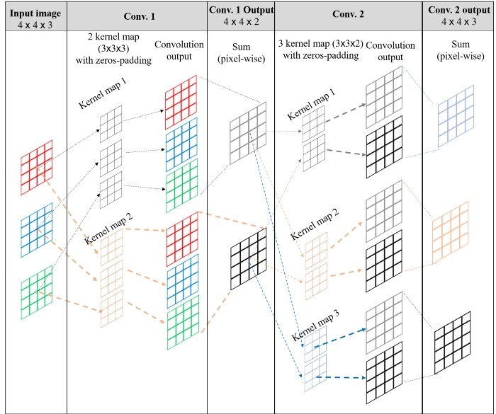 本例子假設輸入一張影像(R, G, B)所以有3個channel的4×4影像輸入,在1st卷積層(Conv. 1)設定2個kernel map (3×3×3(上一層的channel數)),所以1st卷積層(Conv. 1)輸出的影像就會有2張,在2nd卷積層(Conv. 2)設定3個kernel map (3×3×2(上一層的channel數)),所以2nd卷積層(Conv. 2)輸出的影像就會有3張。