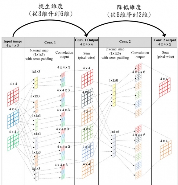 第二個1×1捲積是降低維度數/降低channel數 (channel從6→2)