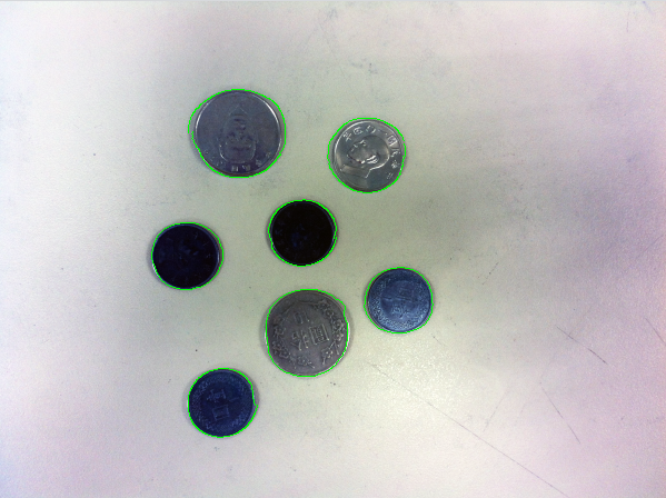 21. cv2.drawContours(coins, contours,-1,(0,255,0),1)
