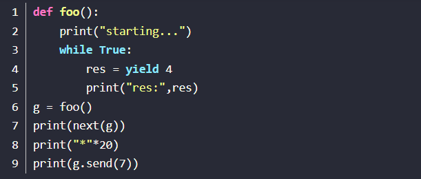 先大致說一下send函數的概念:此時你應該注意到上面那個的紫色的字,還有上面那個res的值為什麼是None,這個變成了7,到底為什麼,這是因為,send是發送一個參數給res的,因為上面講到,return的時候,並沒有把4賦值給res,下次執行的時候只好繼續執行賦值操作,只好賦值為None了,而如果用send的話,開始執行的時候,先接著上一次(return 4之後)執行,先把7賦值給了res,然後執行next的作用,遇見下一回的yield,return出結果後結束