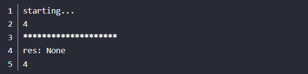 3.程序遇到yield關鍵字,然後把yield想想成return,return了一個4之後,程序停止,並沒有執行賦值給res操作,此時next(g)語句執行完成,所以輸出的前兩行(第一個是while上面的print的結果,第二個是return出的結果)是執行print(next(g))的結果,