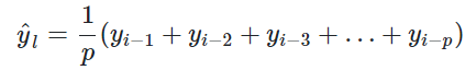 計算移動平均值涉及到一個有時被稱為“滑動窗口”的大小值p。使用簡單的移動平均模型,我們可以根據之前數值的固定有限數p的平均值預測某個時序中的下一個值。這樣,對於所有的i > p: