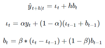 我們從圖中可以看出,該數據集呈上升趨勢。因此我們可以用霍爾特線性趨勢法預測未來價格。該算法包含三個方程:一個水平方程,一個趨勢方程,一個方程將二者相加以得到預測值