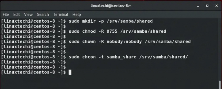 接下來,我們將建立一個名為共享的共用資料夾,並分配必要的權限和所有權,如圖所示。 - $ sudo mkdir -p /srv/samba/shared