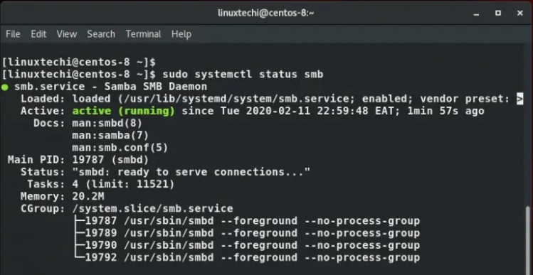 然後確認 smb 服務是否正在運作: - $ sudo systemctl status smb