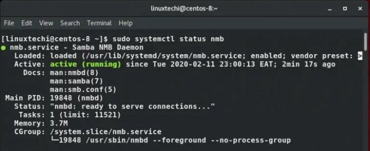同樣確認 nmb 服務是否正在運行,就像我們對 smb 服務所做的那樣: - $ sudo systemctl start nmb