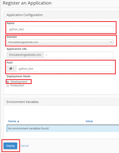 現在,在註冊應用程式下,我們為應用程式命名,然後選擇它將運行的網域,最後輸入應用程式本身的路徑。在本例中,名稱將為python_test。網域將是 thisisatestingwebsite.com 帳戶,路徑將是/home/thisisatest/python_test。我們也在部署模式下選擇了「開發」。
