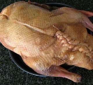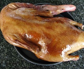 1 光鴨洗淨後用料酒、醬油、鹽裏外抹勻醃製過夜.