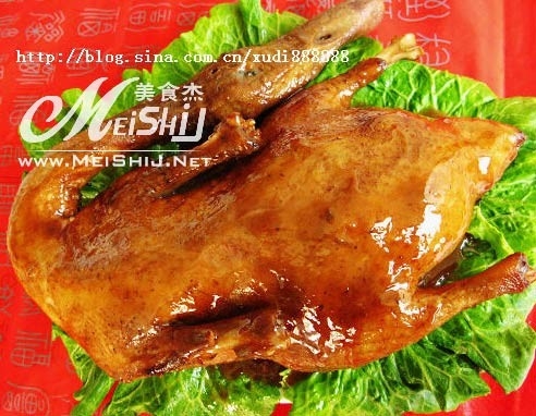 5 把濾去油的鴨子放入盤中, 鍋中留少許餘油,煸香薑片,加入醬油、糖、香葉、八角、桂皮和適量請水,煮開後熬製15分鐘成醬汁. 把鴨子放入蒸鍋中,醬汁淋在鴨身上,中火蒸2小時至鴨子熟透.
