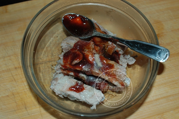 4.撈出子排,放碗裏,放三勺蜜汁烤肉醬,一勺蠔油,一勺生抽,一點點鹽,大半勺蜂蜜,最後撒上黑胡椒粉.(勺子大小參照圖片中)