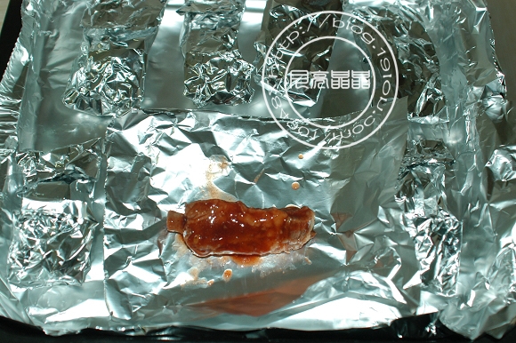 6.第二天取出排骨,烤箱200度預熱,把錫紙裁成長方形,每張錫紙包一根醃制好的排骨,記得把碗底醃制排骨的汁澆一勺在排骨上,然後包起來